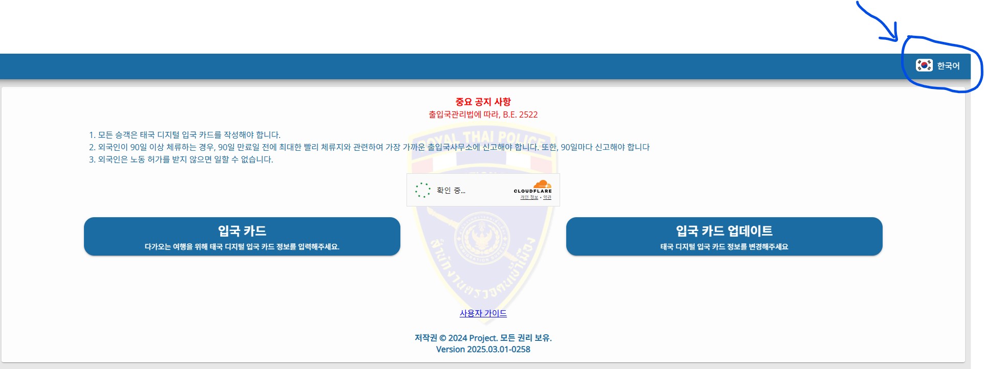 먼저 태국 디지털 입국 카드(TDAC) 웹사이트를 접속하면 다음과 같은 화면이 나옵니다. 여기서 우측 상단 언어를 한국어로 변경하여 진행하여도 된다.